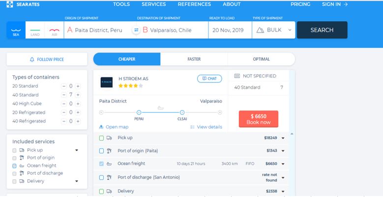 Para realizar los cálculos del flete nos basamos en los resultados encontrados en la plataforma SEARATES, la cual brindó información del envío desde el puerto de Paita hasta el de Valparaíso, de manera terrestre y marítimo.