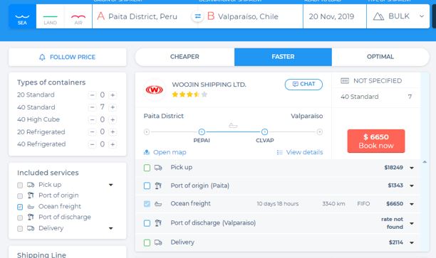Esta plataforma nos indicó una empresa llamada «H STROEM AS» nos cobraba 6650 dólares por el total de la carga que se transportaría en 7 Bulk containers de 40 pies. De la misma manera la empresa «WOOJIN SHIPPING LTD» nos resulta el mismo valor del flete, con la diferencia que llegaría 3 horas antes.
