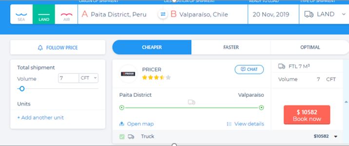 Por otro lado, la empresa «PRICE» nos resulta 10582 dólares, esto sería mayor a los otros marítimos pero es mucho más rápido que ambos. Este envío llegaría en 2 o 3 días, en cambio marítimo casi 11 días.